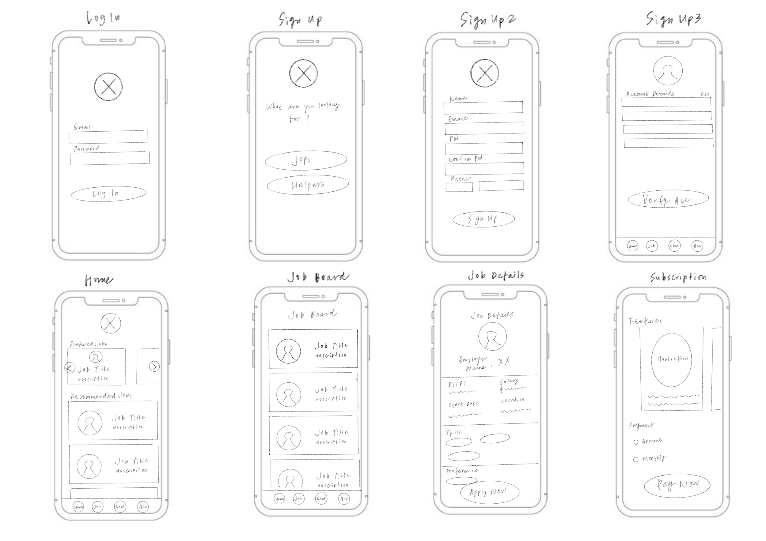 One group of potential app users will be people who are busy with work, requiring the need to hire helpers. Therefore, my goal was to make the app as simple to use as possible in order to save users' time. I used procreate to quickly sketch out my ideas.